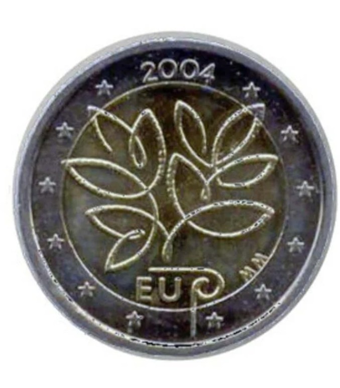 Pièce de 2 euros finlandaise (2004) : une pièce célébrant l’élargissement de l’UE. Avec un tirage d’1 million d’exemplaires, il peut valoir jusqu’à 60 euros.