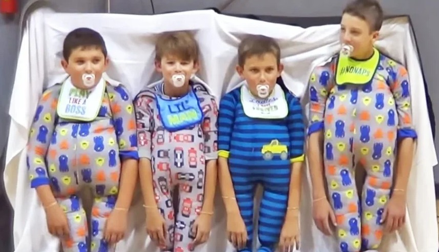 In 2017, a group of four fifth-graders from New Braunfels Christian Academy in Texas delivered an unforgettable performance at the Elementary Talent Show. To add to the surprise, the boys began their performance hidden beneath a black sheet. When the sheet was pulled back, the audience was stunned to see them dressed as toddlers, complete with small prosthetic legs that they manipulated with their arms. This unexpected sight immediately sparked laughter and curiosity.